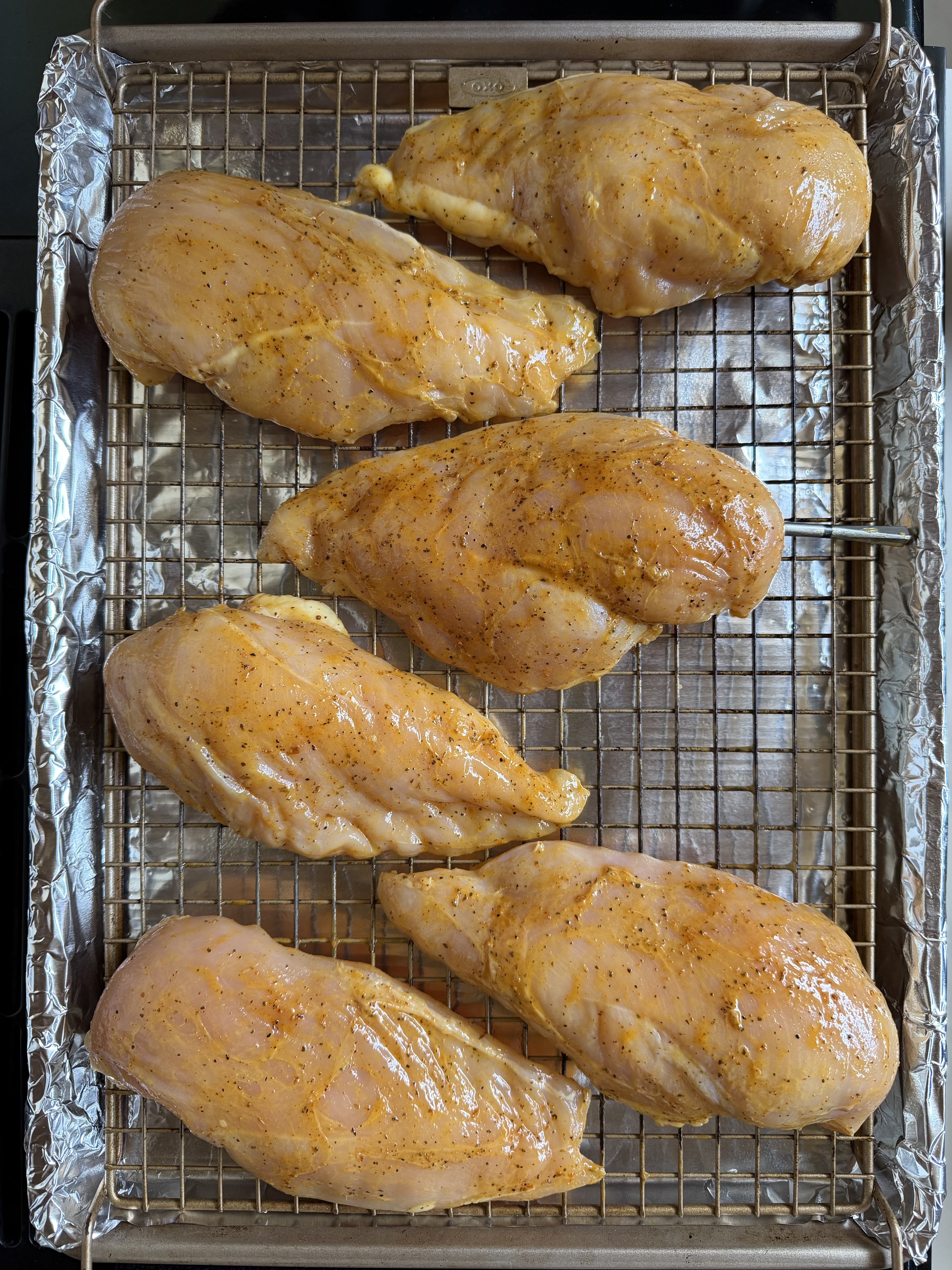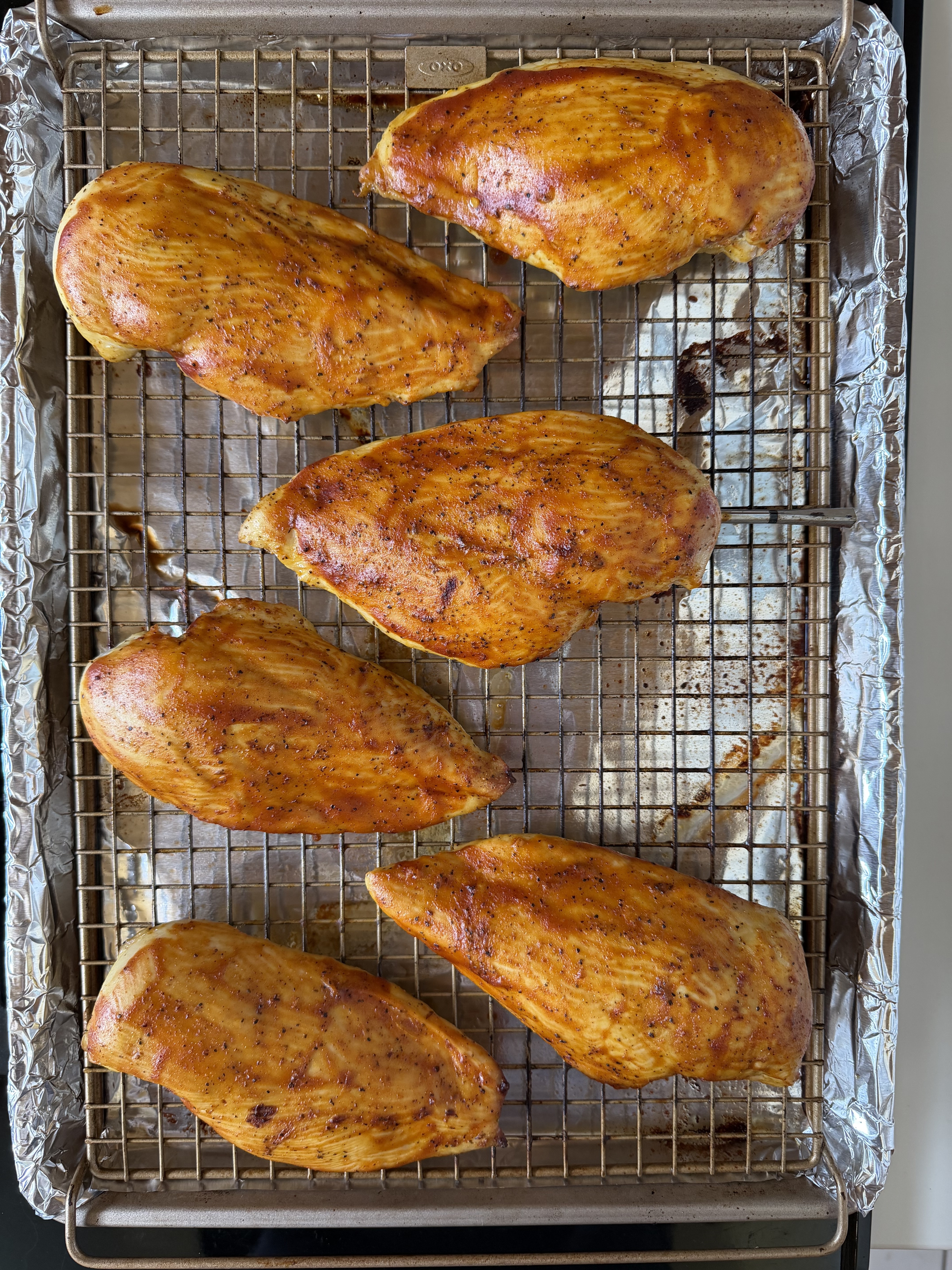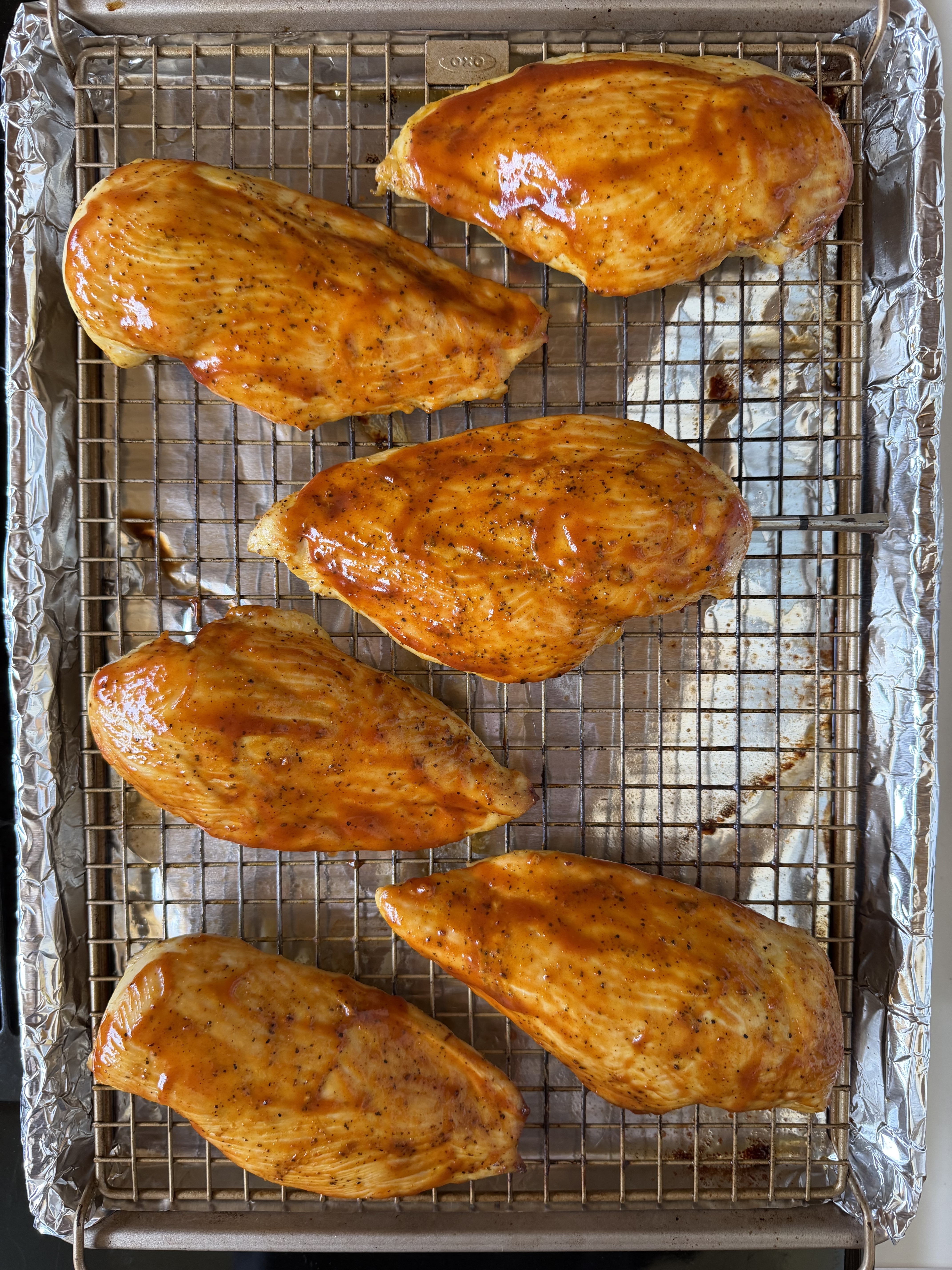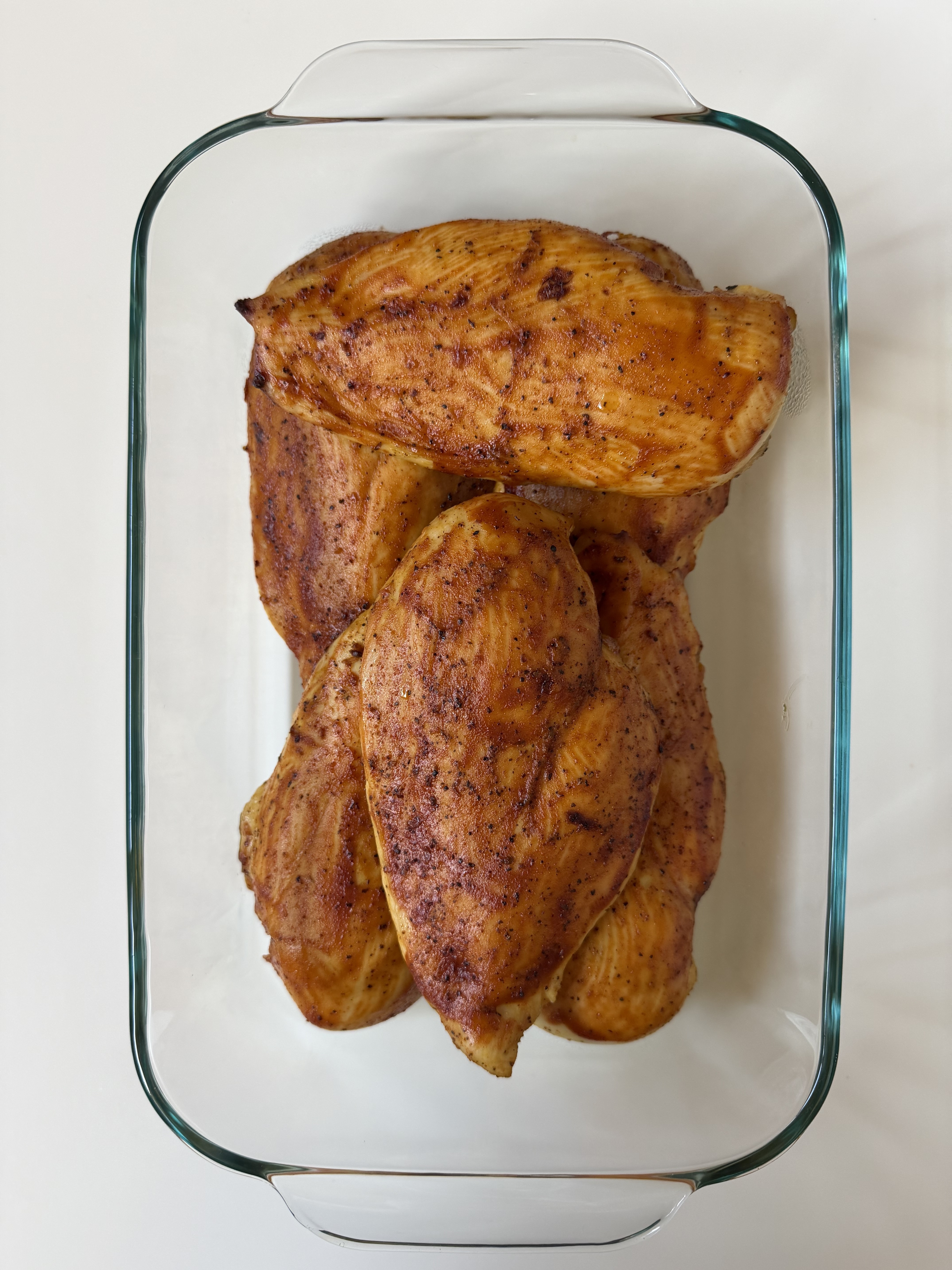 A bowl full of baked chicken breasts, rubbed with mustard, salt, paprika, and pepper, then glazed with barbecue sauce.
