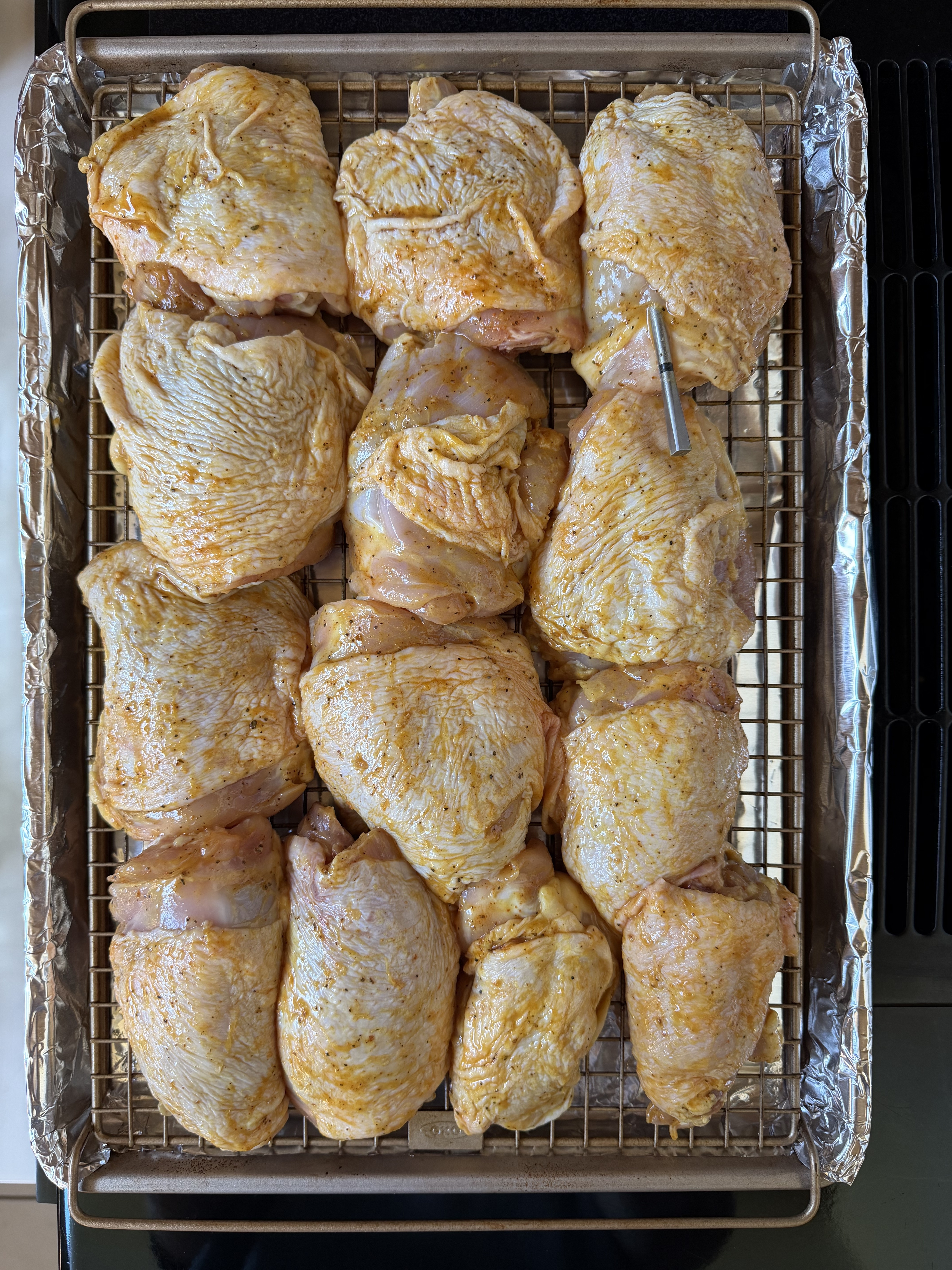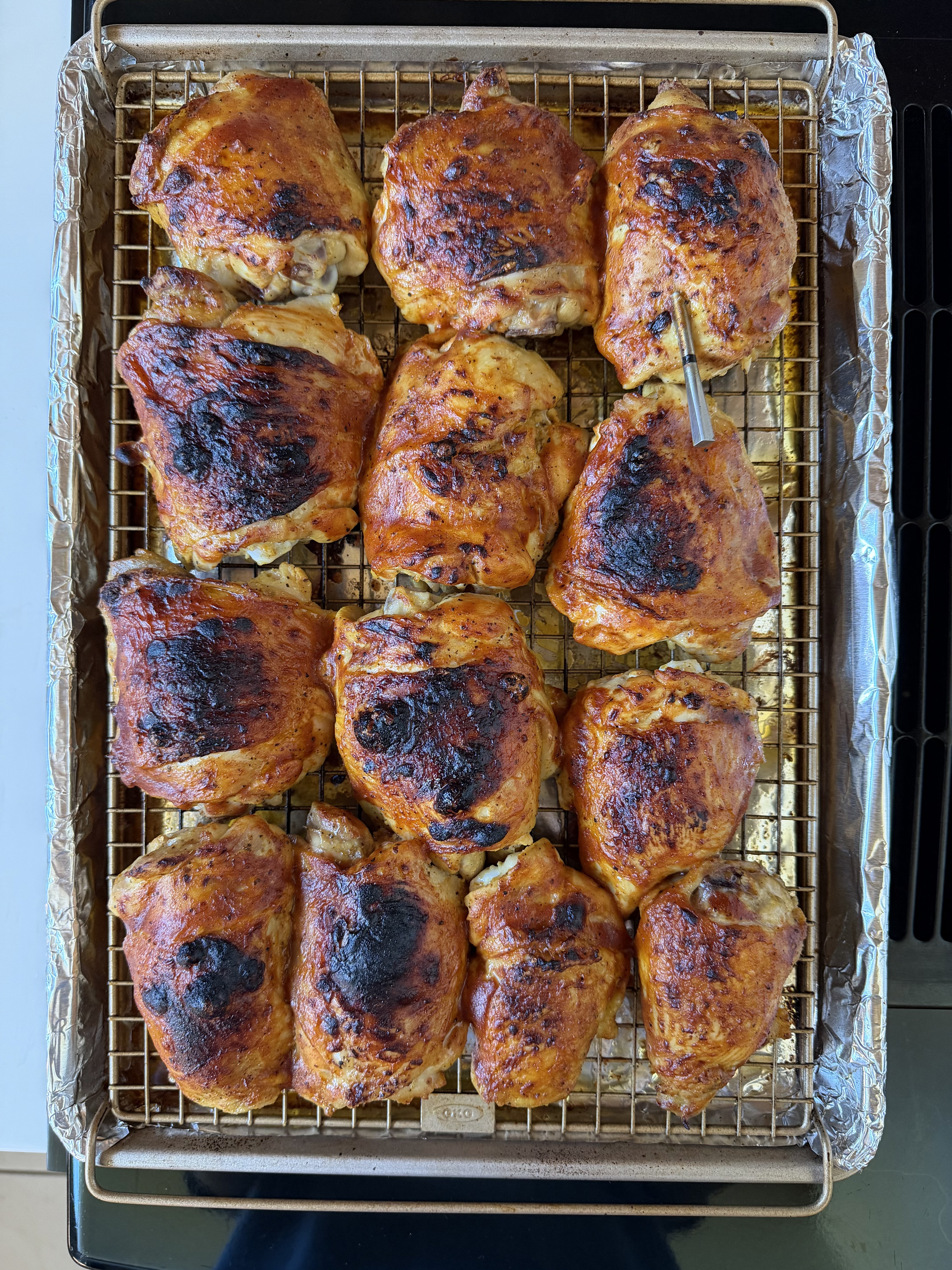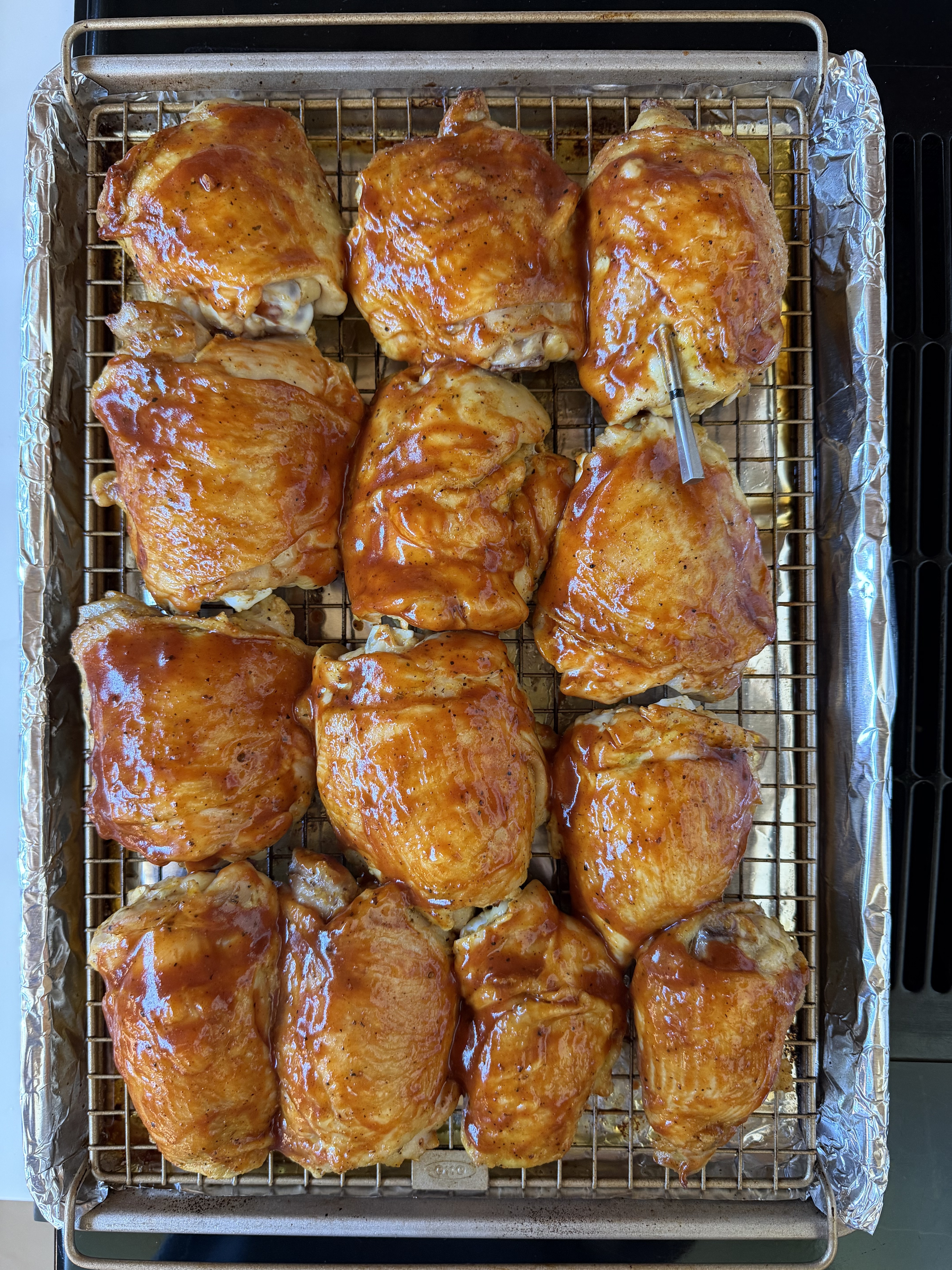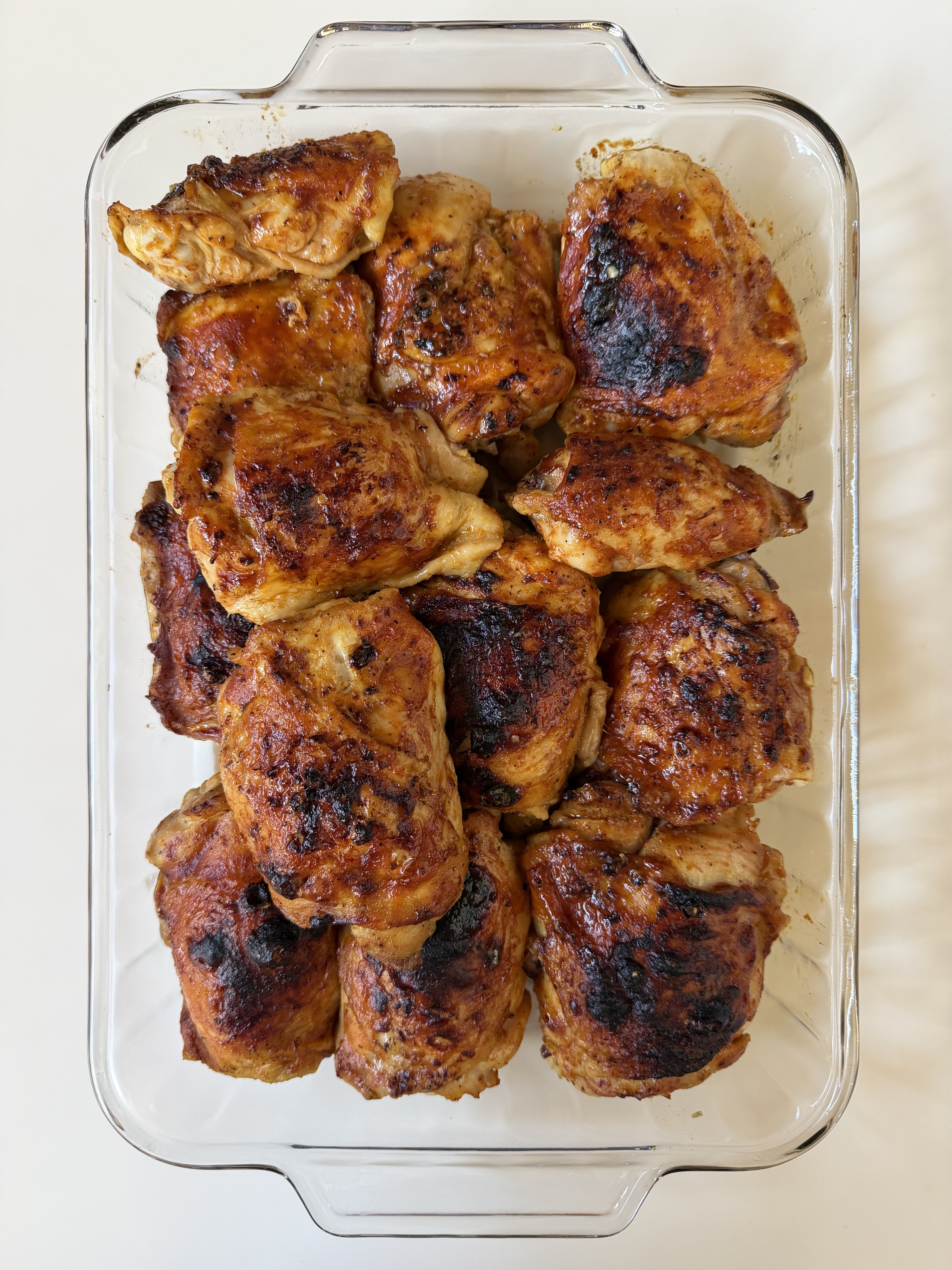 A bowl full of roasted chicken thighs, rubbed with spices and mustard, and glazed with barbecue sauce.