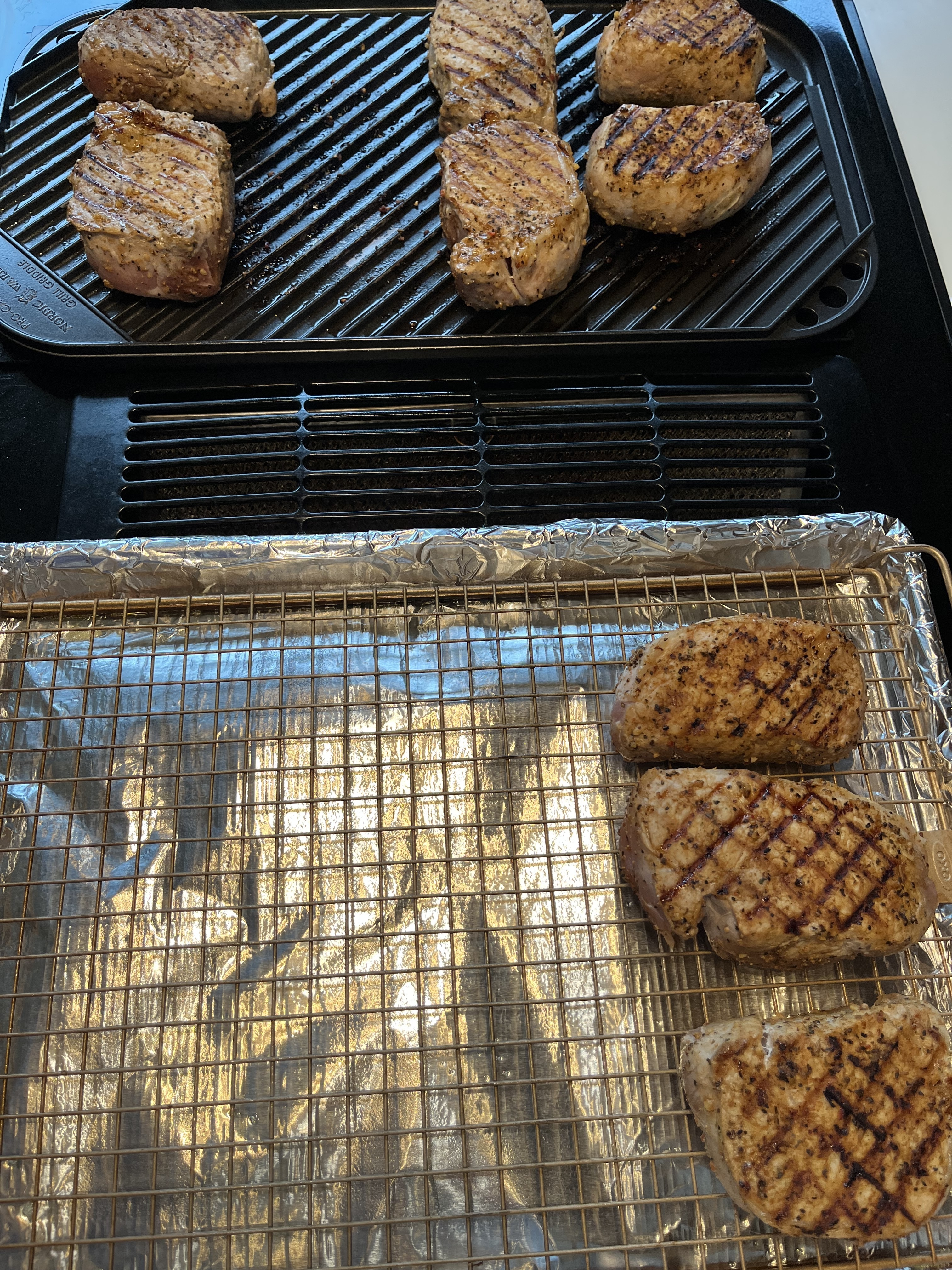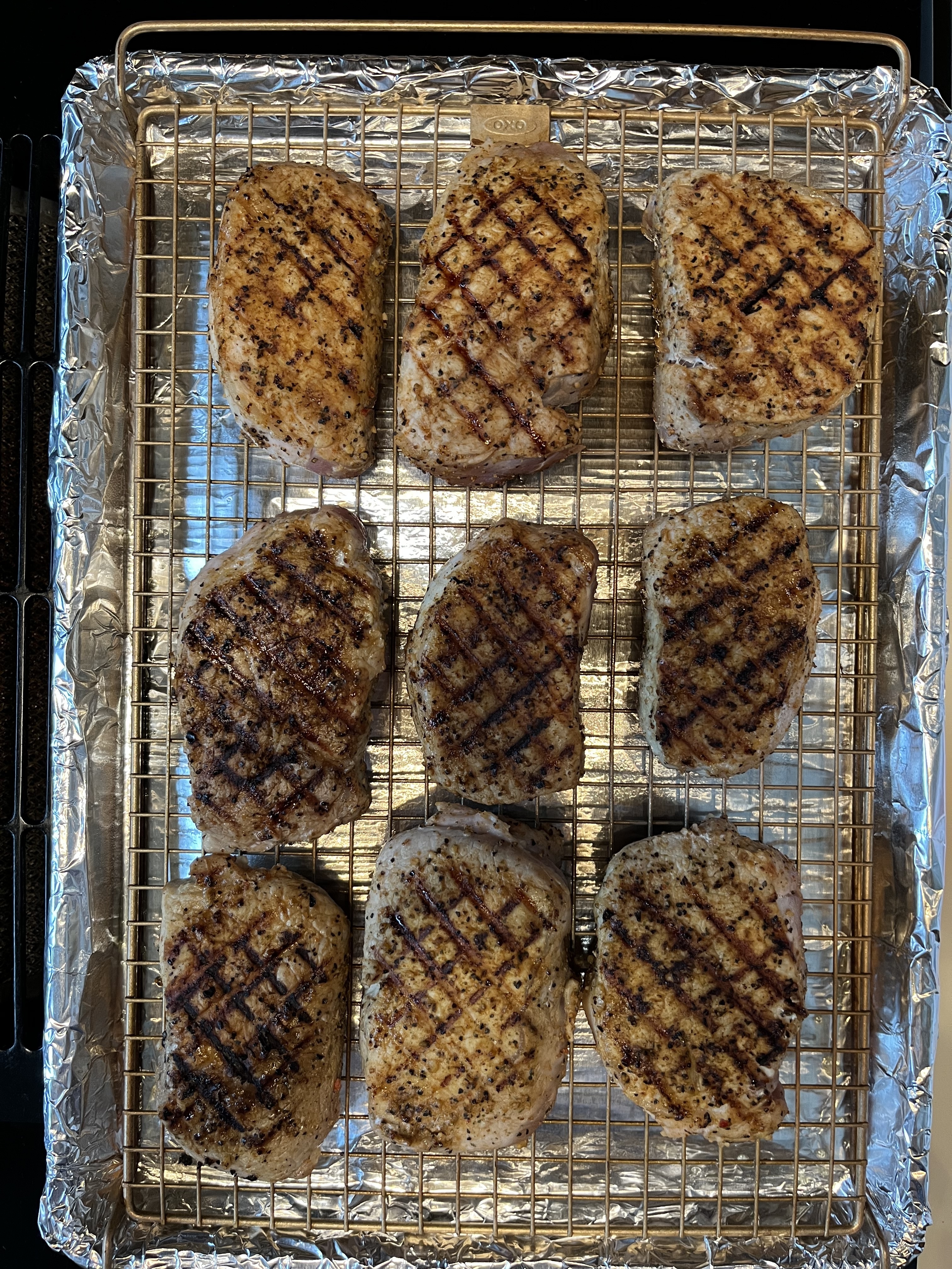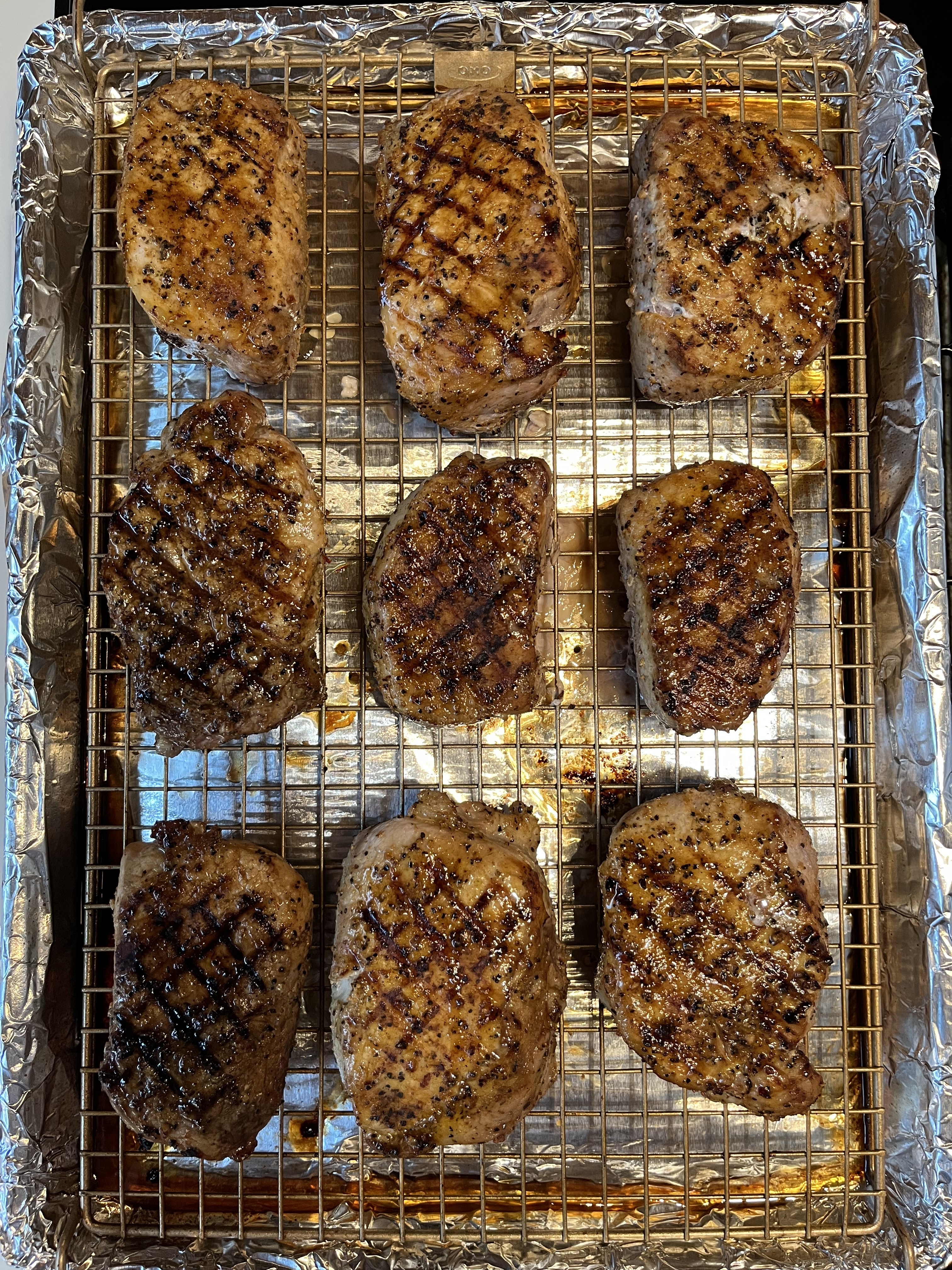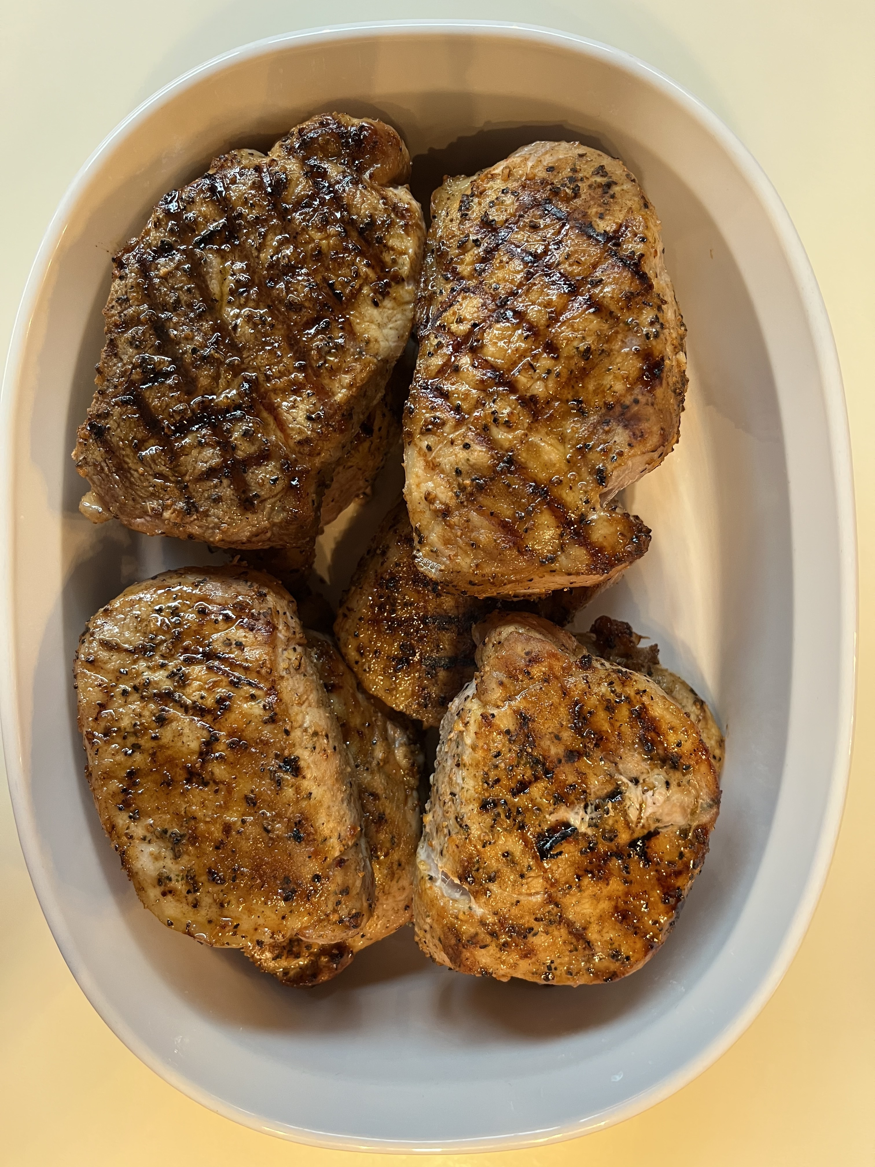 A bowl full of reverse-seared pork loin chops, bourbon-salt-pepper-garlic rubbed, and oven-baked to temp.