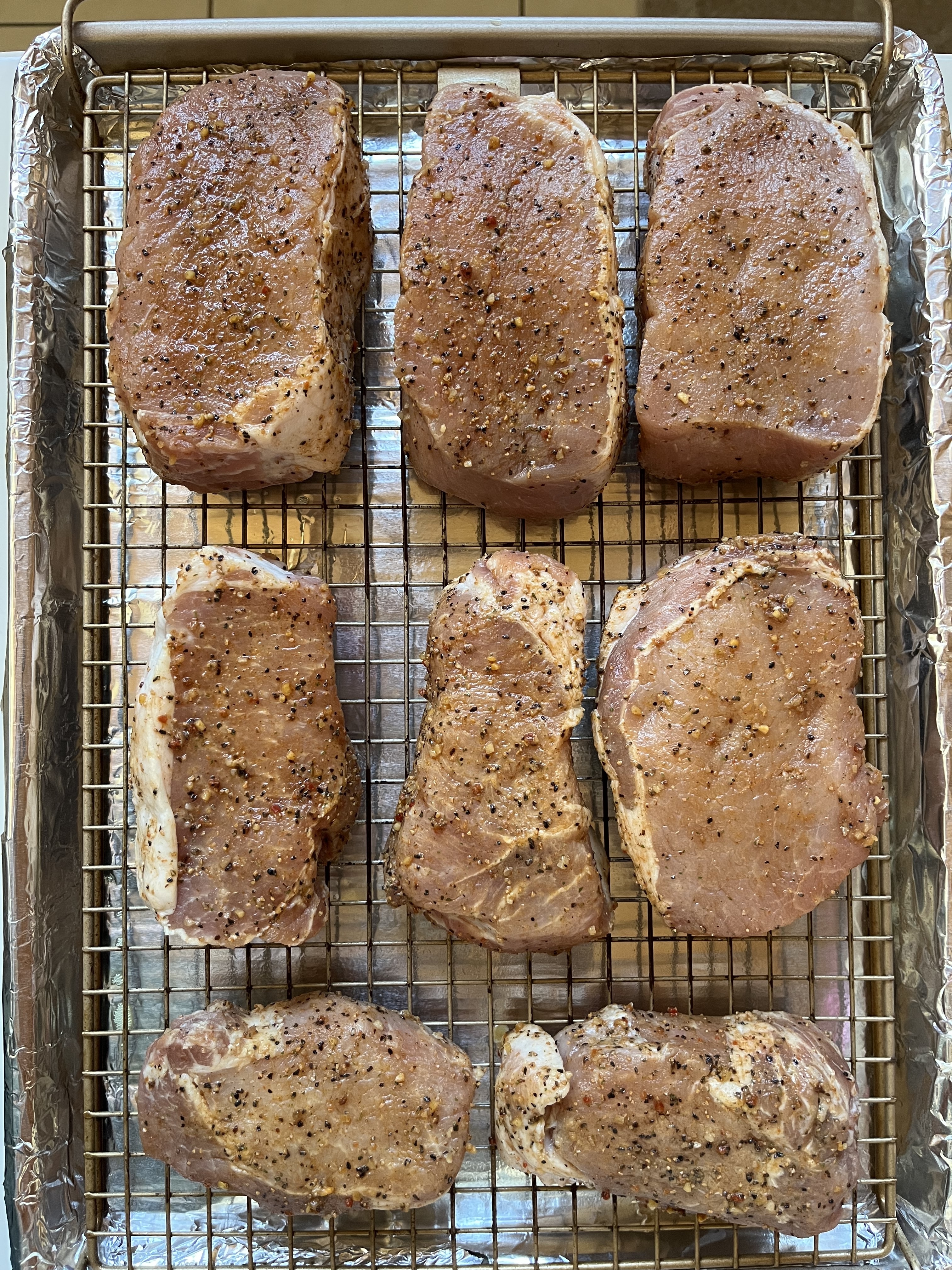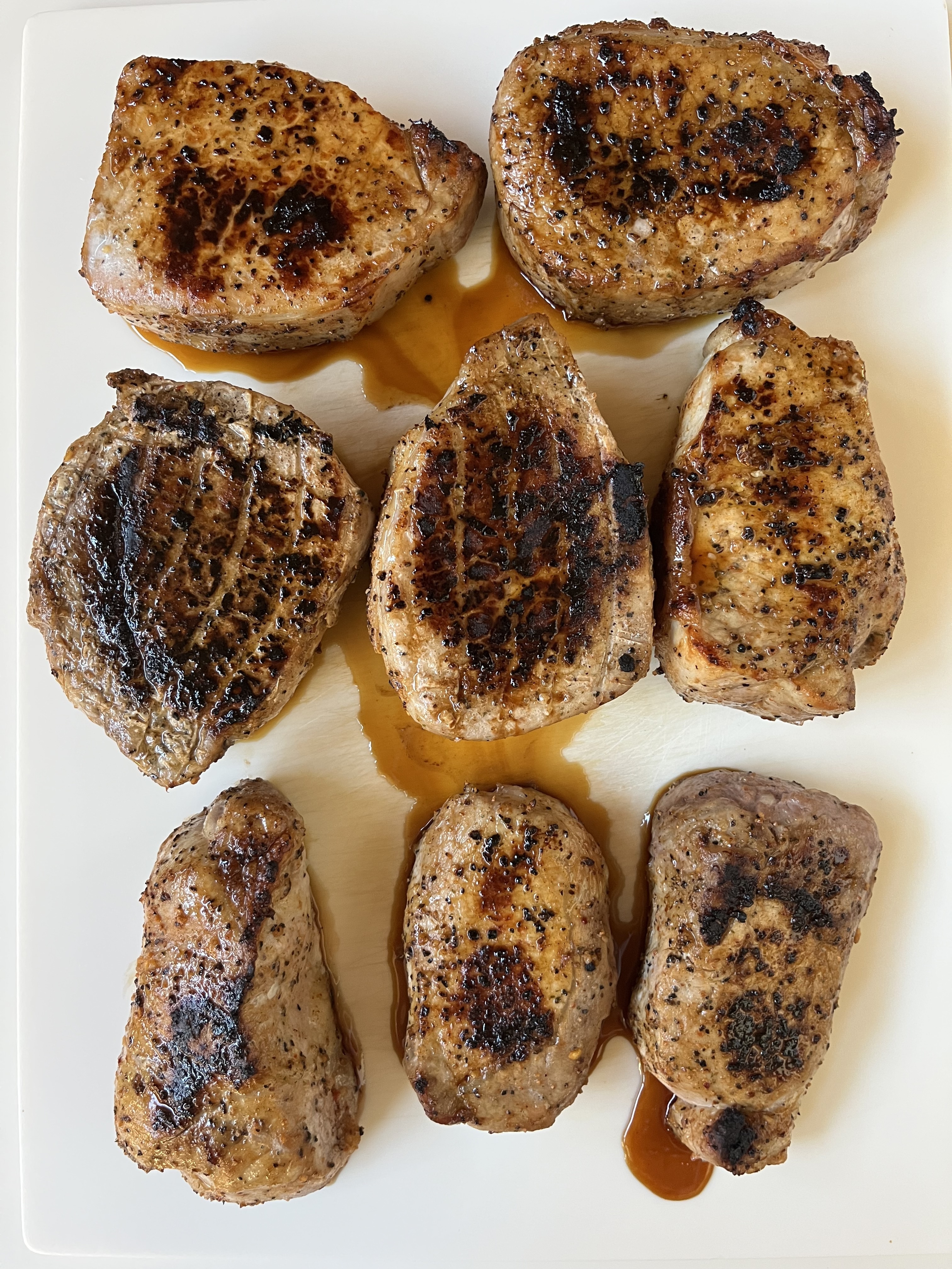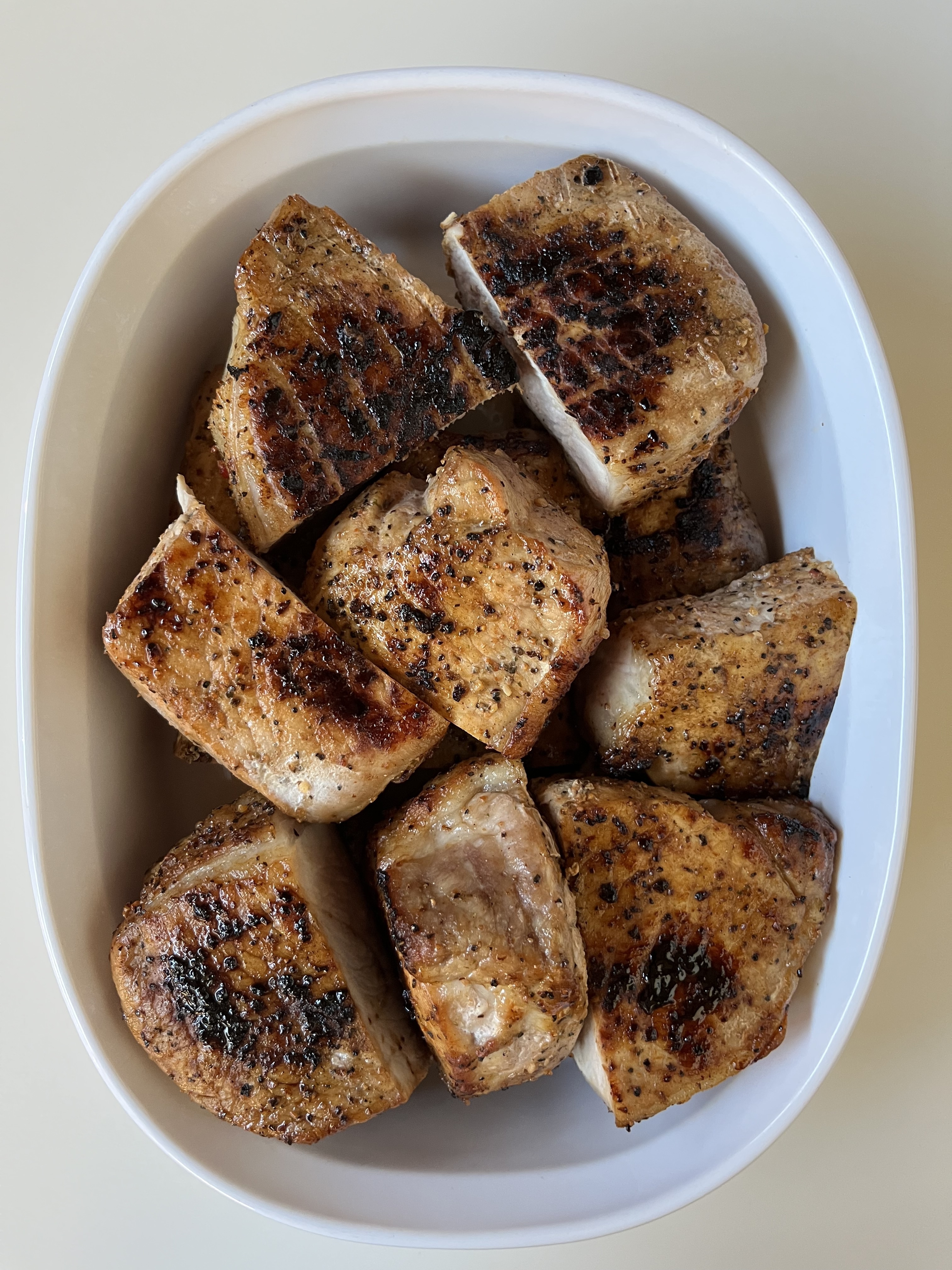 A bowl full of reverse-seared pork loin chops, barbecue-rubbed and roasted to temp.