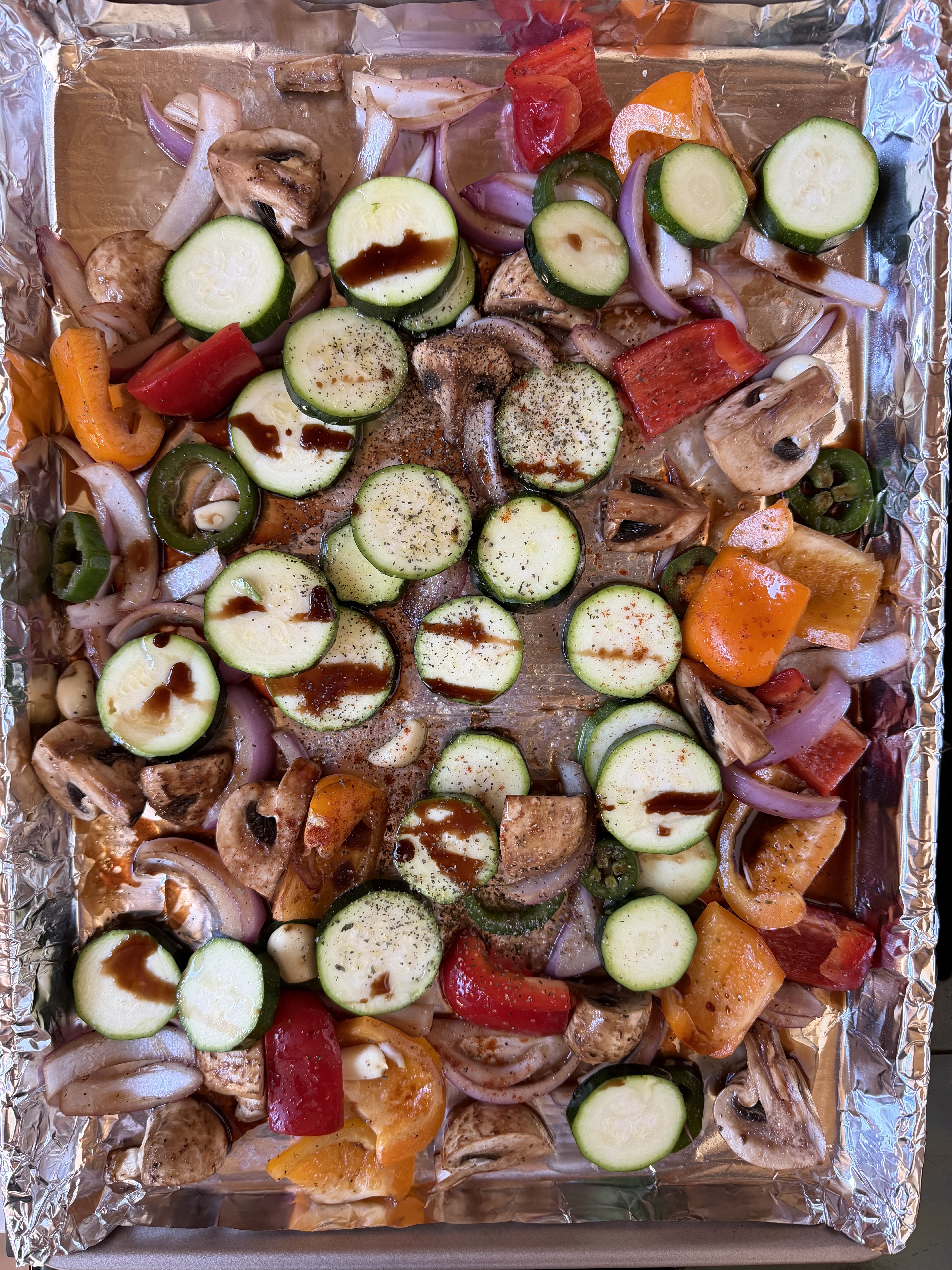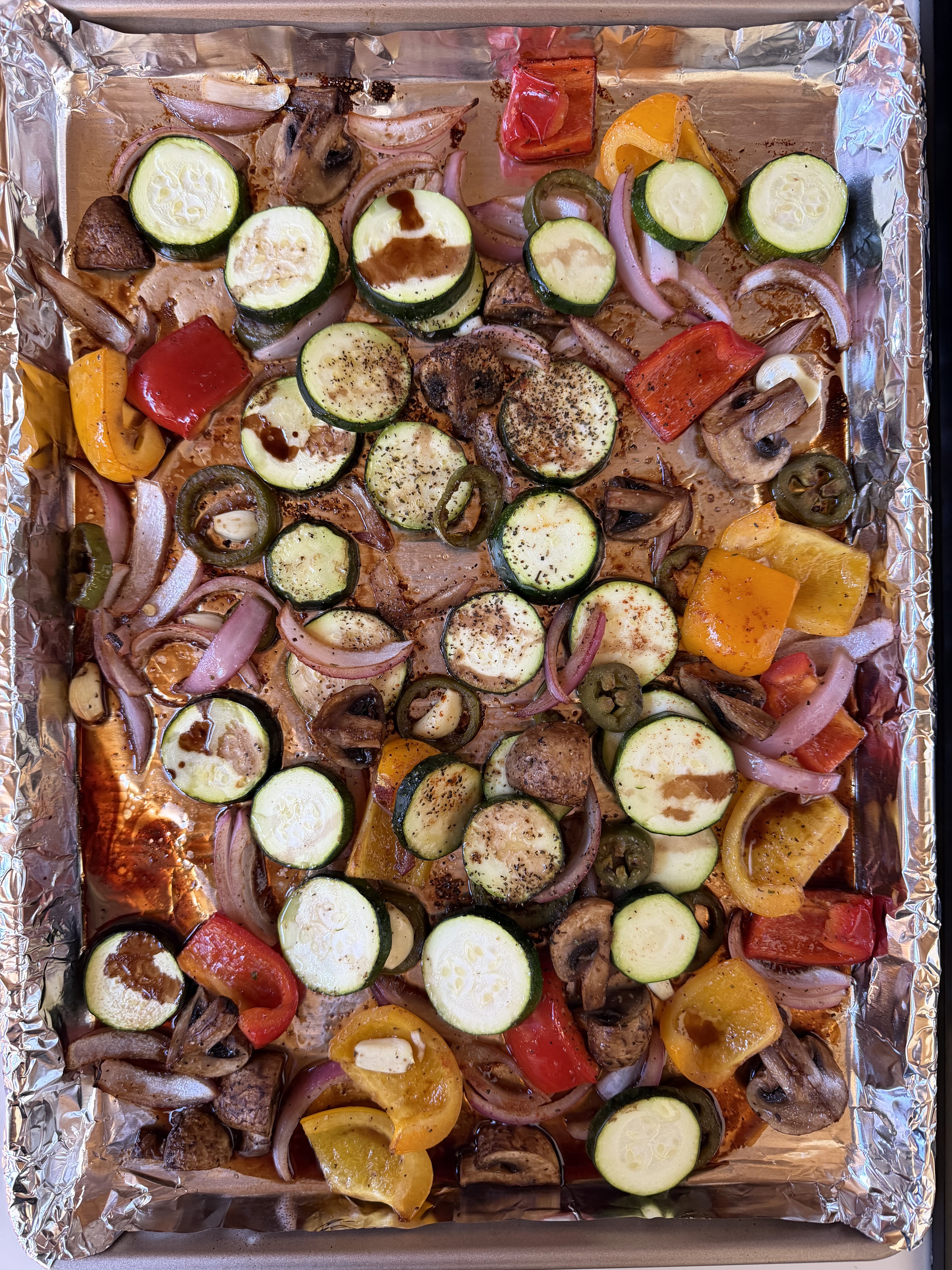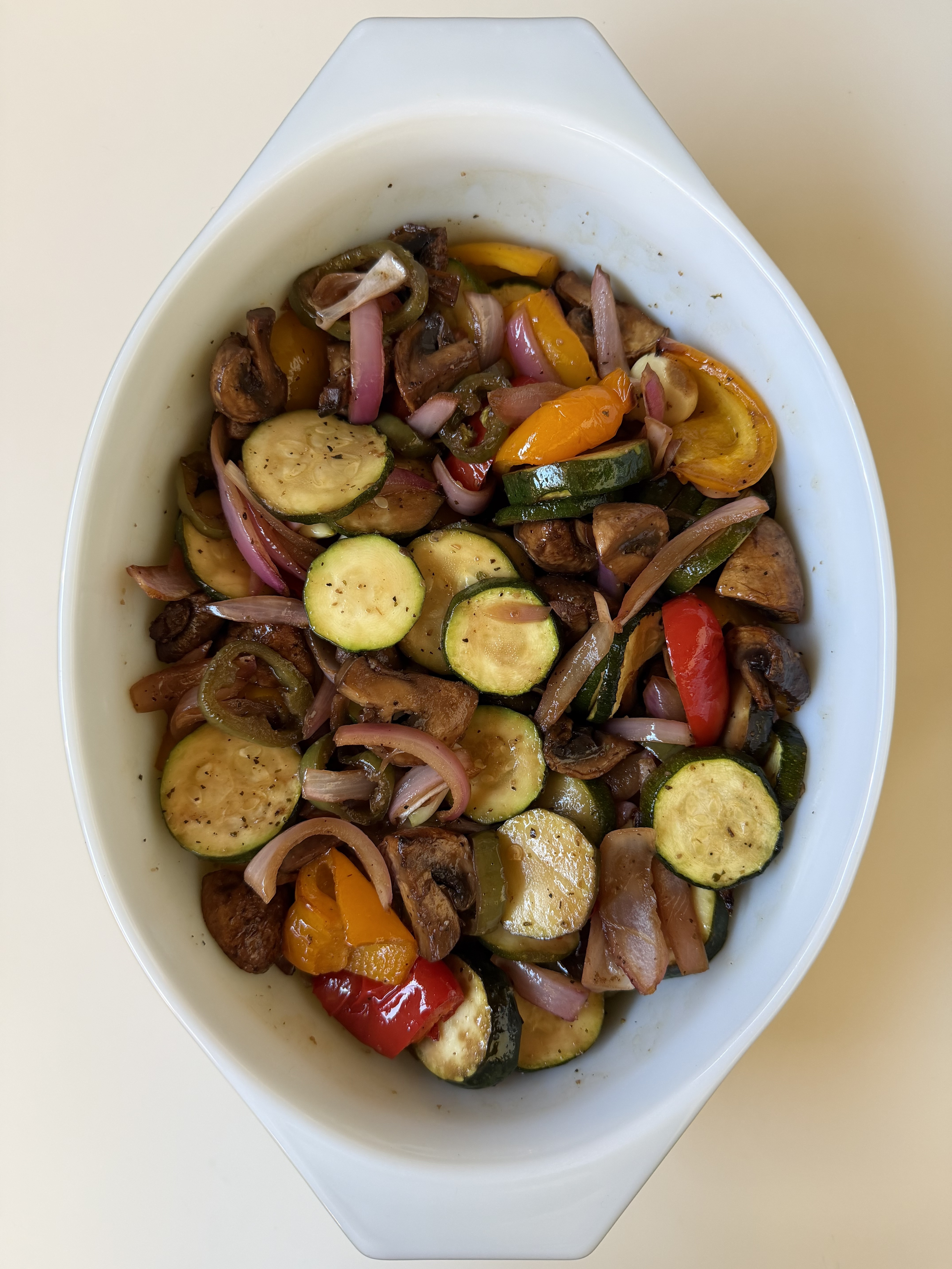 A bowl full of roast zucchini, jalapeño and bell peppers, mushrooms, red onions, and garlic.