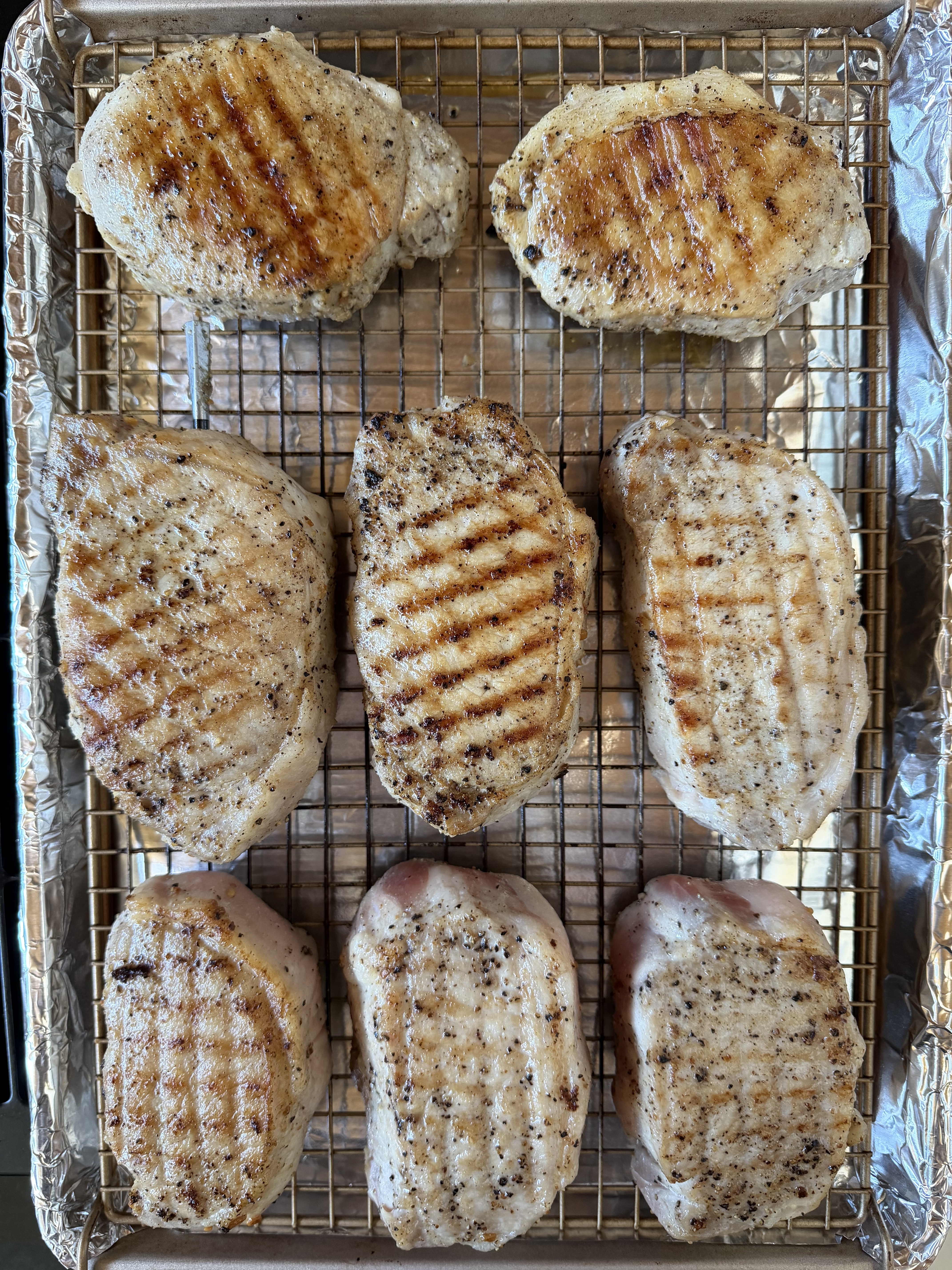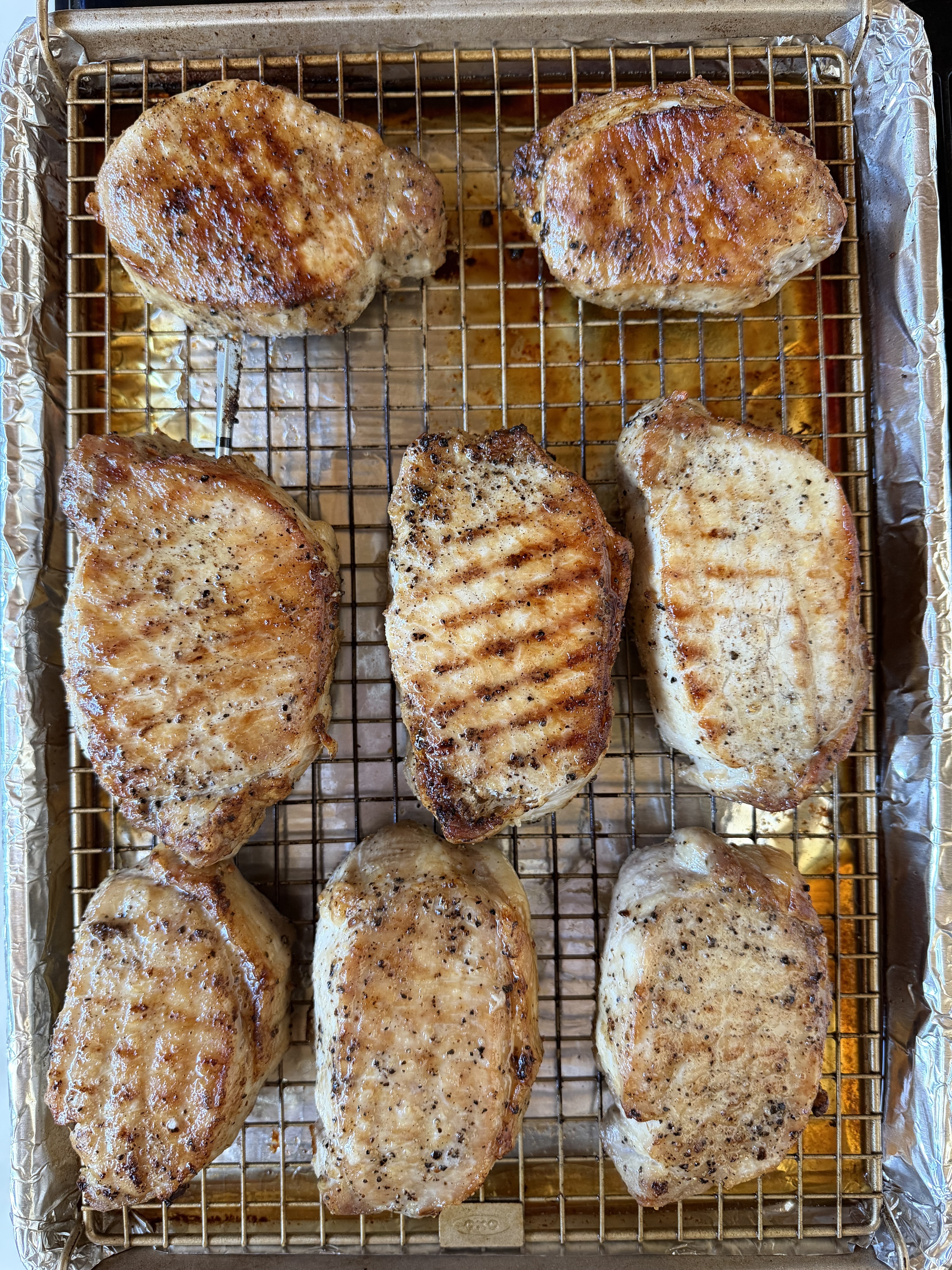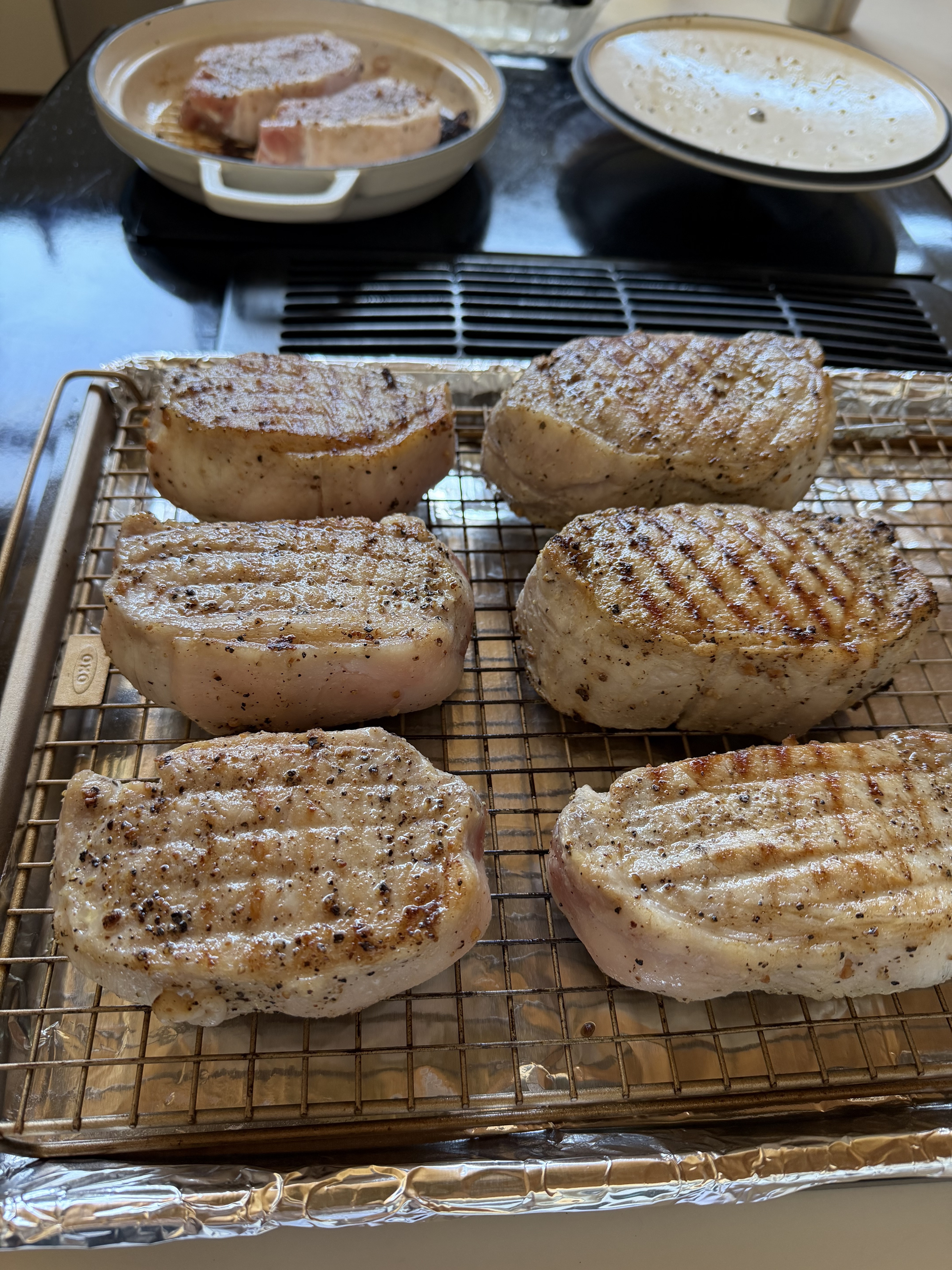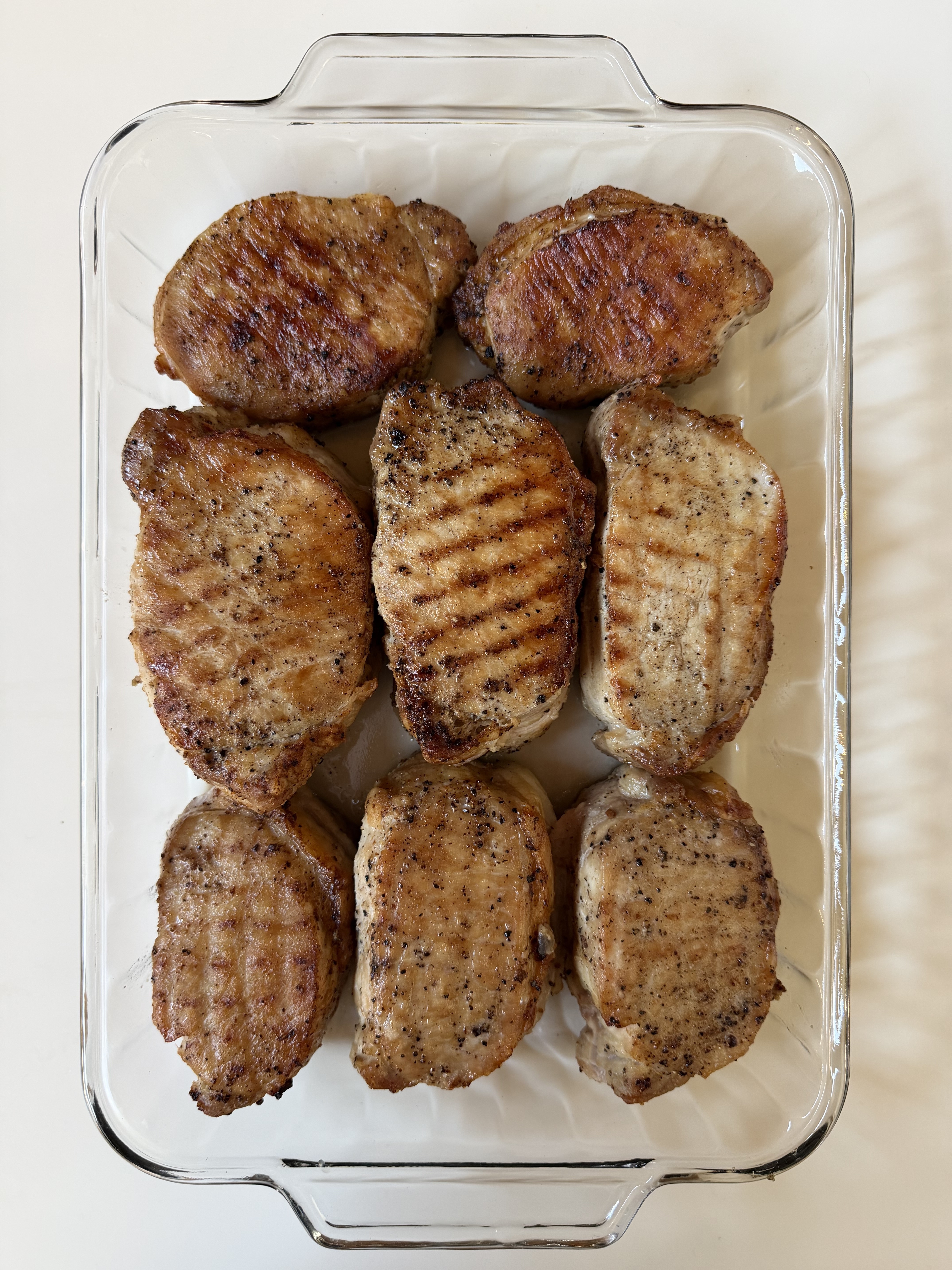 A bowl full of reverse-seared pork loin chops, SPG-rubbed and roasted to temp.