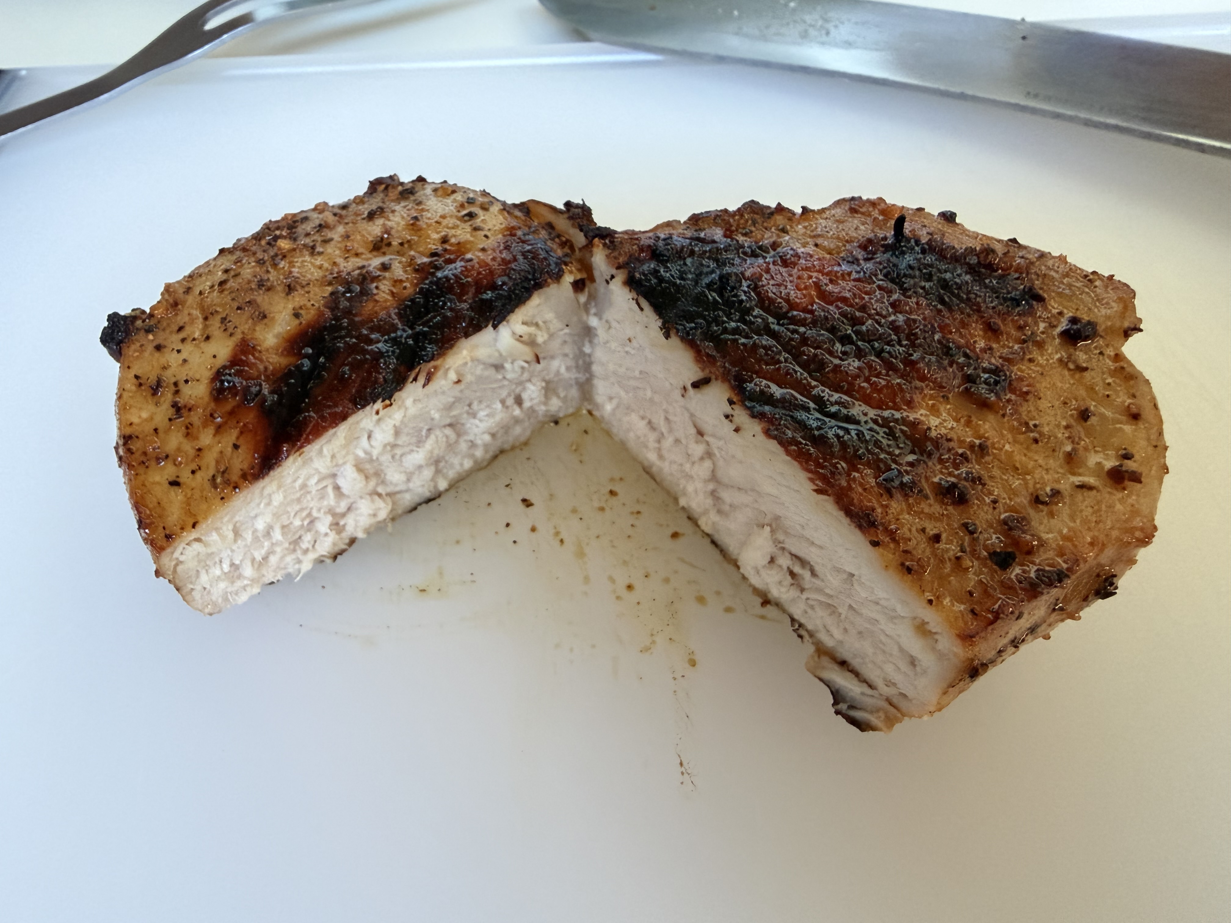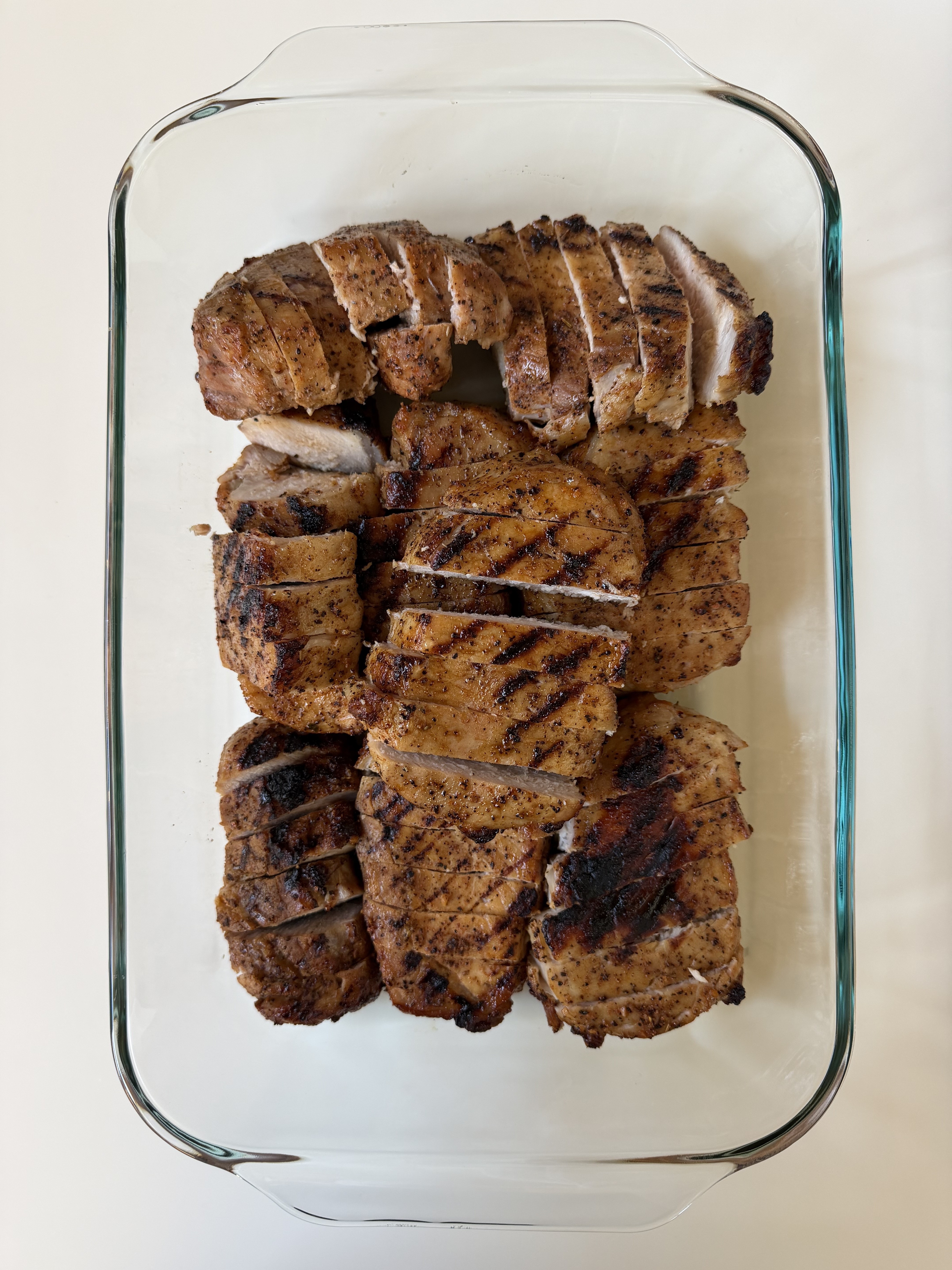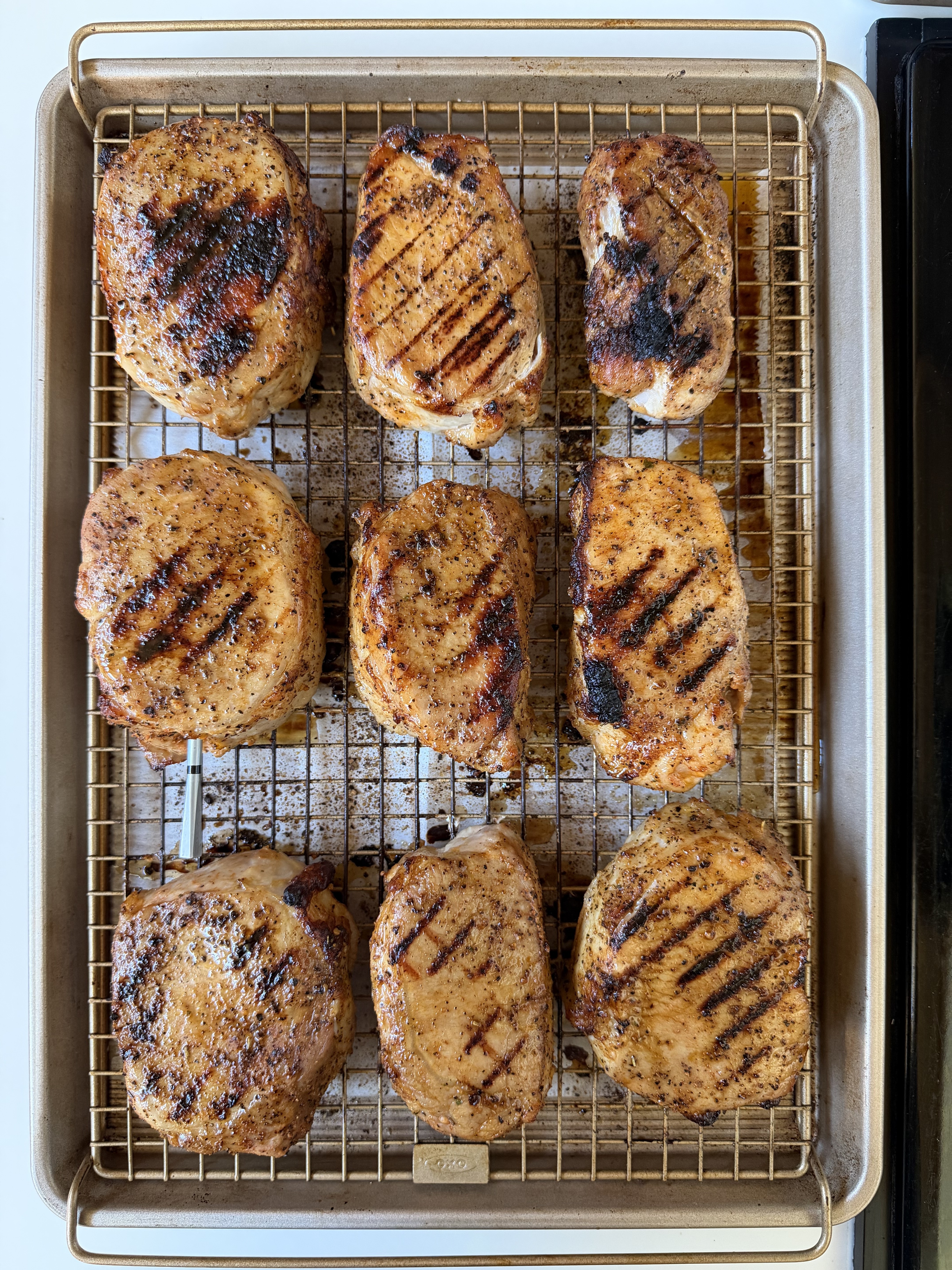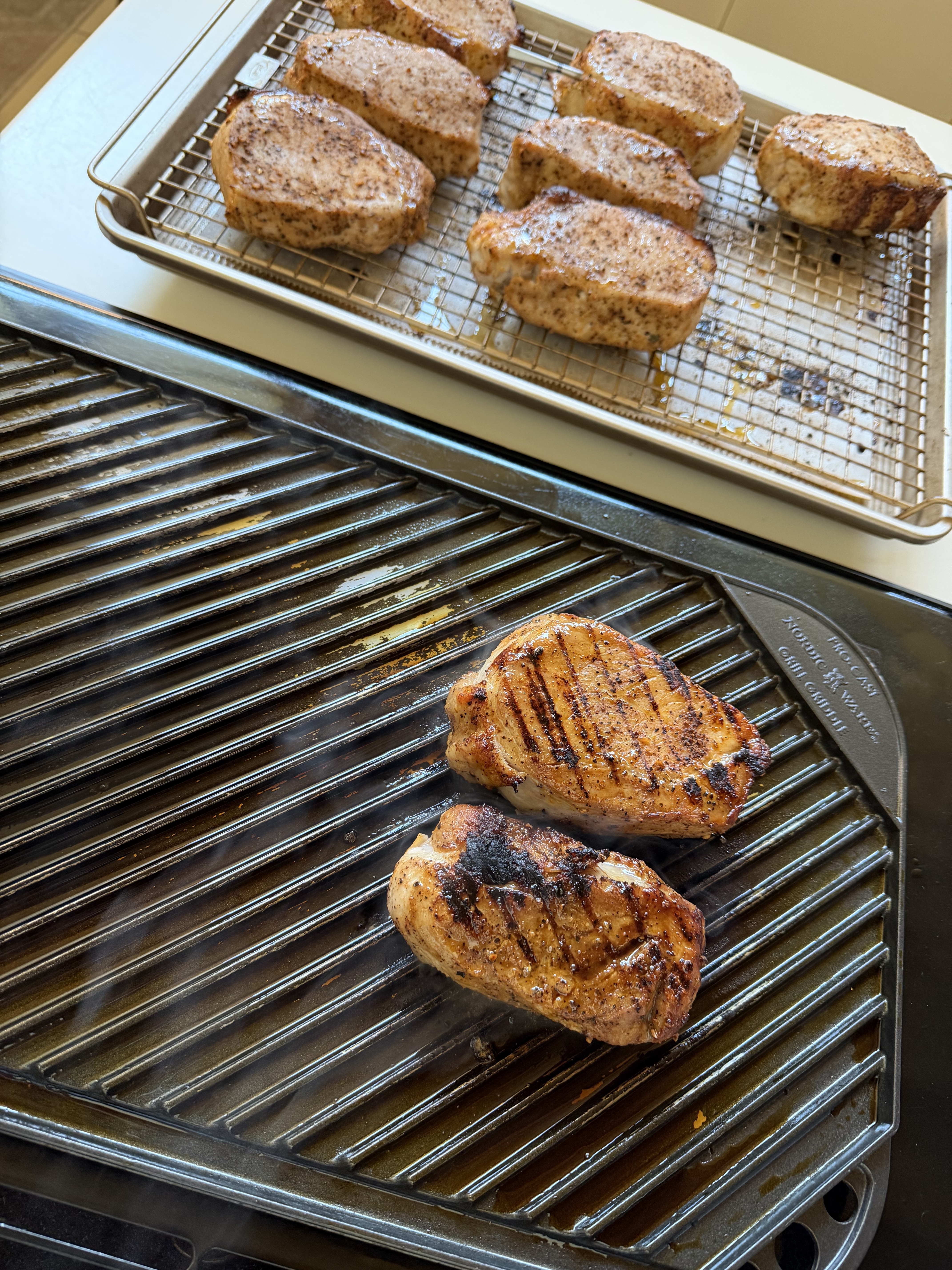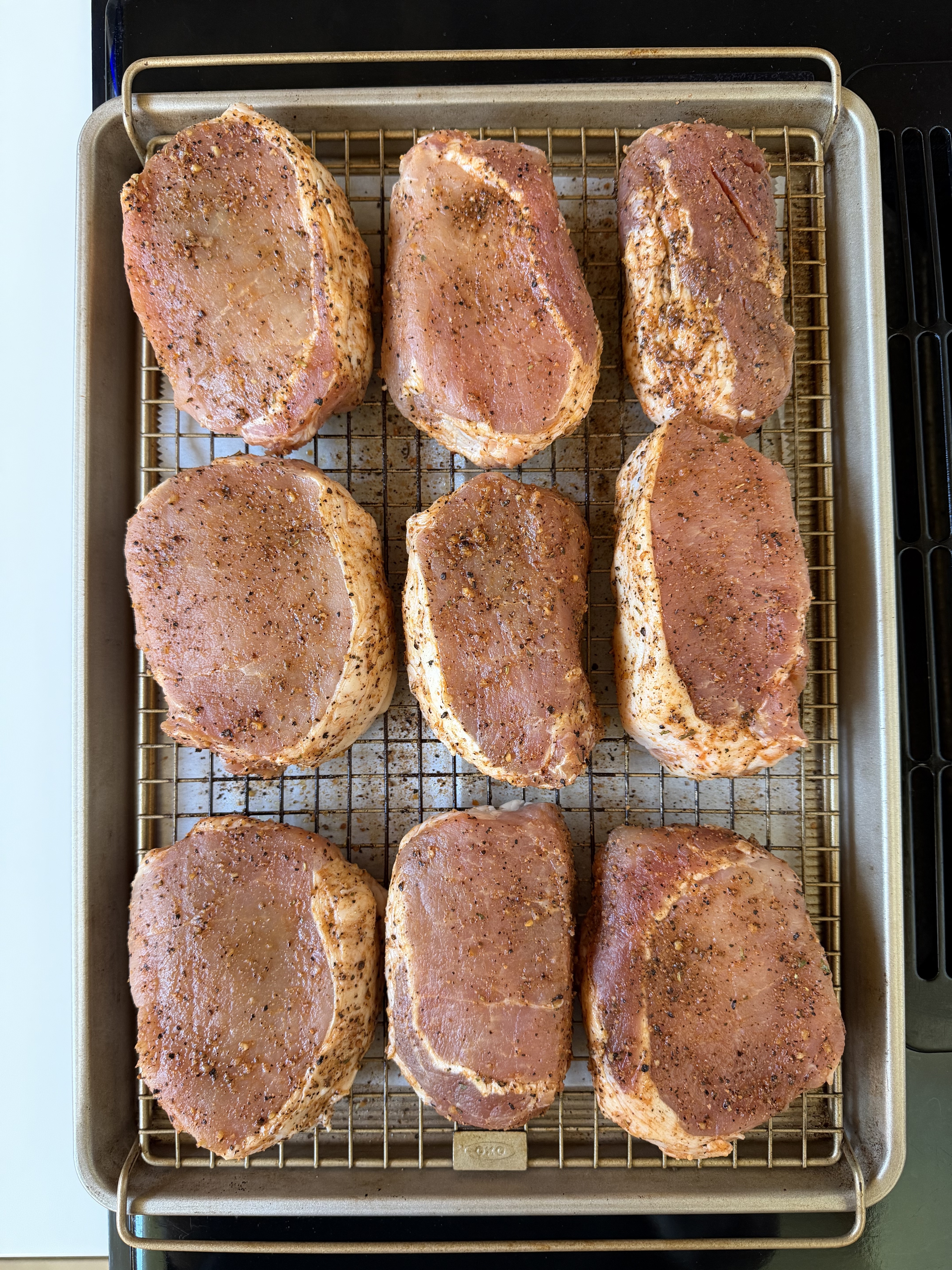 A bowl full of reverse-seared pork loin chops, rubbed in Sriracha sauce, salt, pepper, and spices.